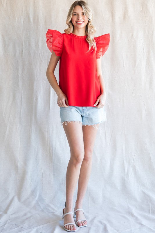 Mixed Fabric Ruffled Cap Sleeves Top