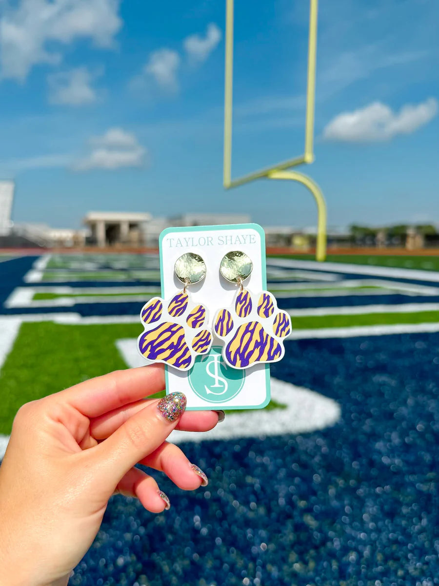 Show your fierce spirit with the TS-Fighting Tiger Paw earrings. Featuring bold purple and gold colors, these striking earrings capture the powerful essence of the tiger paw, making them perfect to express your strength and style. Lightweight and eye-catching, they add a vibrant touch that completes any outfit effortlessly.